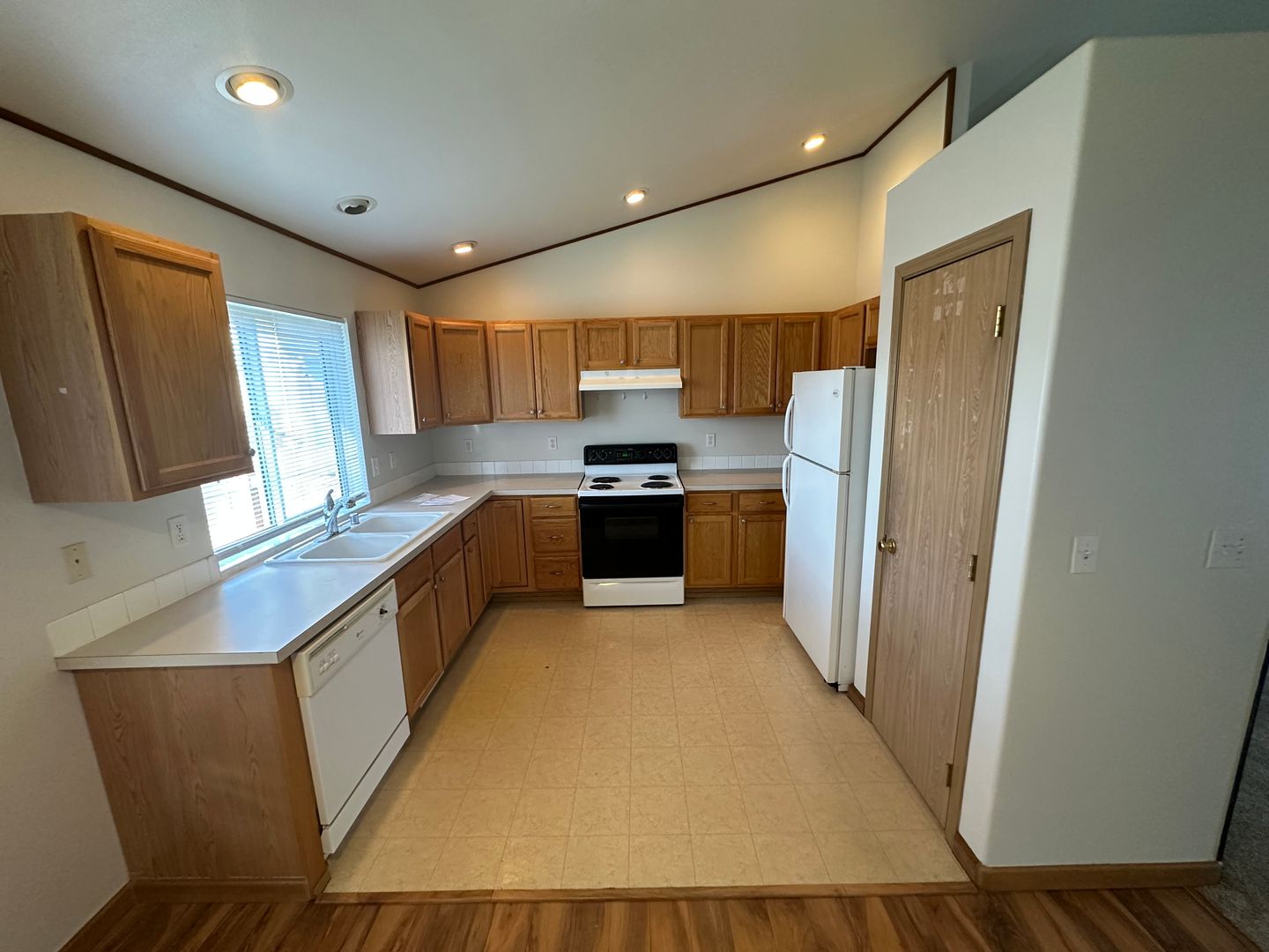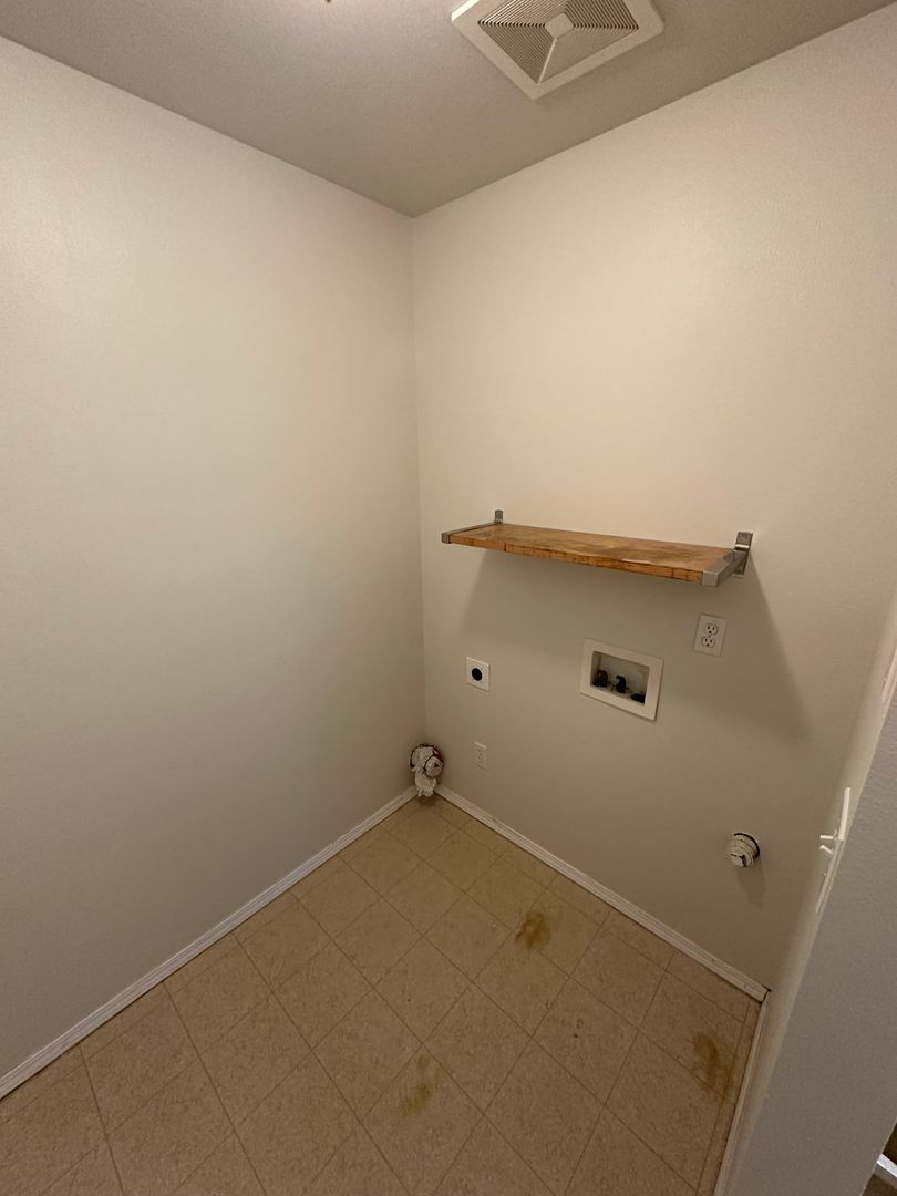 Kitchen with refrigerator, stove, and dishwasher. Laundry room with washer and dryer hookups.